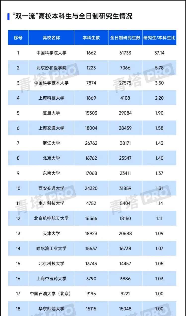 从“双一流”高校的2022-2023年学年本科教学质量报告可以看出各高校在校生人数情况,其中有不少高校全日制研究生数量超过或与本科生持平。上海科技大学、上海交通大学、浙江大学、北京大学、东南大学、西安交通大学等研究生数量较为显著地超过了本科生数量。