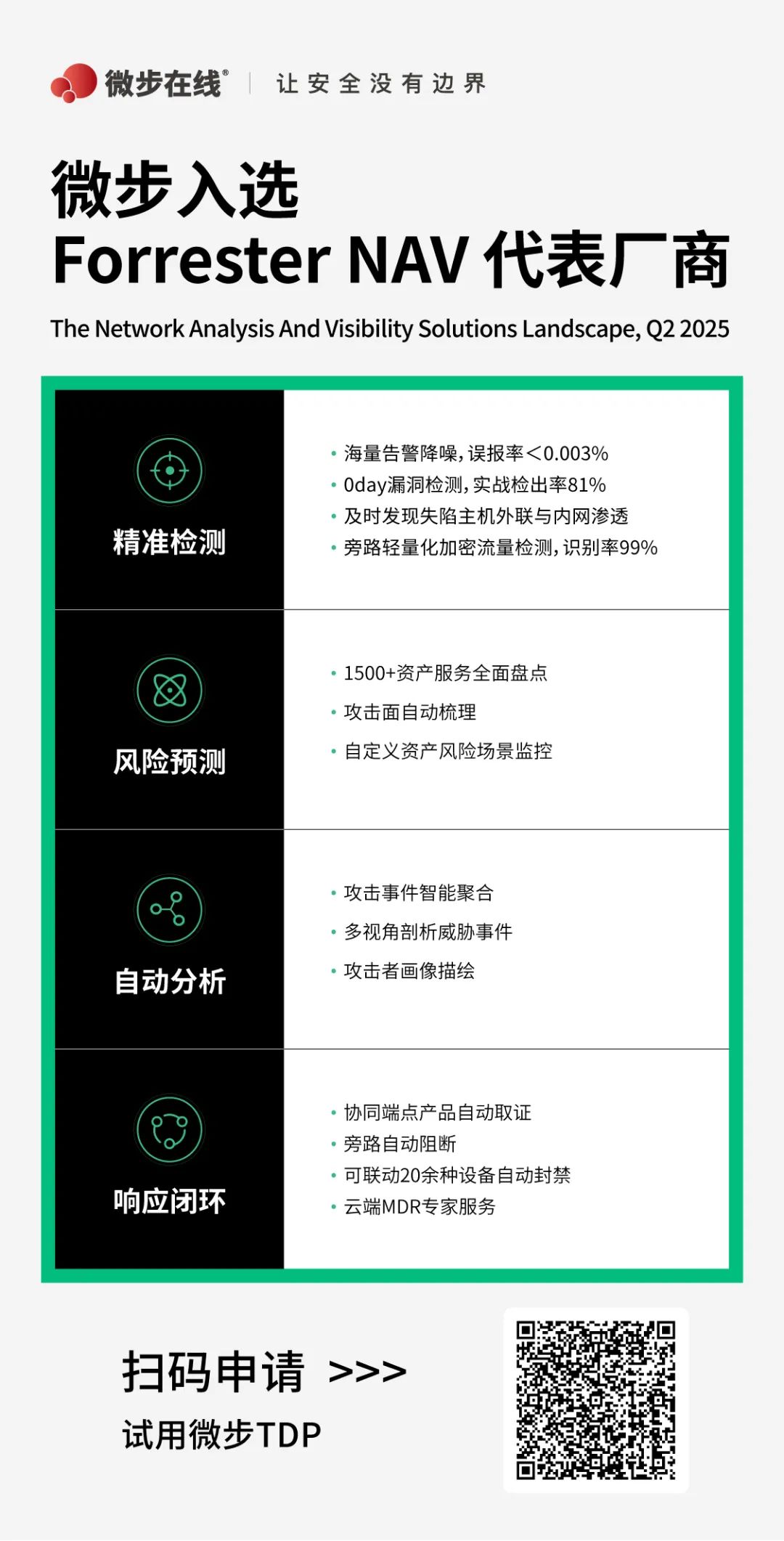 近日,国际咨询机构Forrester发布《The Network Analysis And Visibility Solutions Landscape, Q2 2025》报告(以下简称“报告”),对全球提供网络流量检测与响应的厂商进行了深入的评估与分析。微步凭借旗下威胁感知平台TDP在流量、资产和行为方面的可见性、威胁检测的准确性及自动化响应领先能力入选报告,成为全球NAV代表厂商,技术实力得到认可。