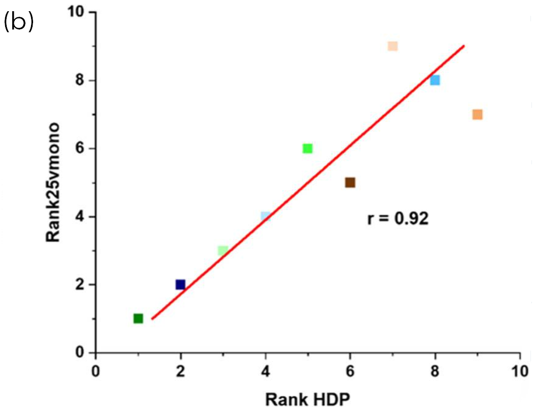 图2. LASSO回归确定了五个关键的DAs(a);HDP与25℃单体降解速率强相关(b)
