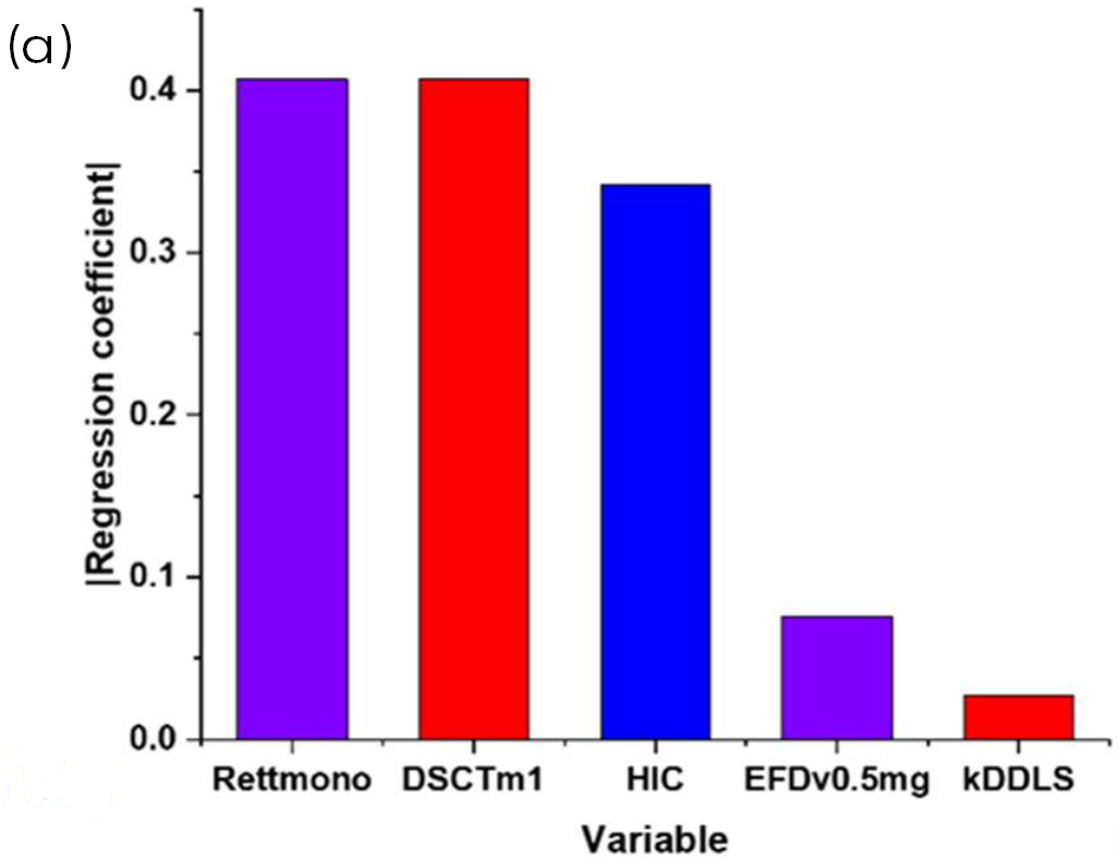 Leon F. Willis等研究者使用LASSO回归从19个t0 DAs中筛选出5个关键DAs组合成一个综合可开发性参数HDP,能够在零时间点快速准确地预测分子后续储存过程中的稳定性,并且与25°C稳定性高度相关,r=0.92。值得关注的是,kD的回归系数很小,但将其删除会导致LASSO没有获得相关性,从而证明了kD的重要性。另外,对于40℃稳定性,LASSO选择的唯一相关变量是DSC Tm1(r = 0.86),验证了聚类分析中Tm1(DSC)与MonoASv40C同属于红色家族的结果,也验证了抗体在高温40℃下降解可能与25℃无关的观察结果。