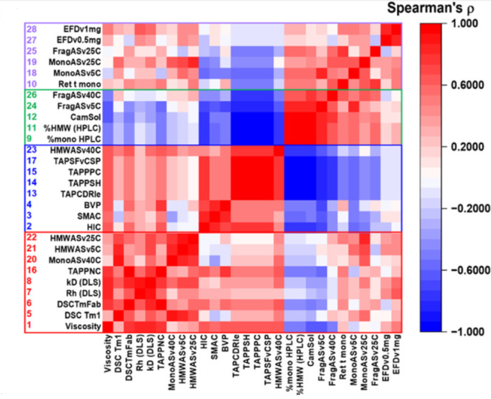 Spearman相关系数的层次聚类分析可以发现DAs冗余性,将28个DAs分为四个可开发性家族,如下图1所示。红色家族最大,包含黏度Viscosity,热稳定性Tm1(DSC)、TmFab(DSC),胶体稳定性kD(DLS)和稳定性纯度变化MonoASv40C,HMWASc25C,HMWASc5C。蓝色家族包括HIC,SMAC,BVP和多个TAP指标CDRle, PSH, PPC, SFvCSP。其中AC-SINS,BMI,%frag和EFDv0.25mg被认为难以聚类。