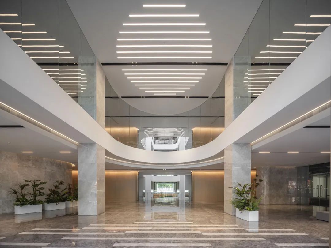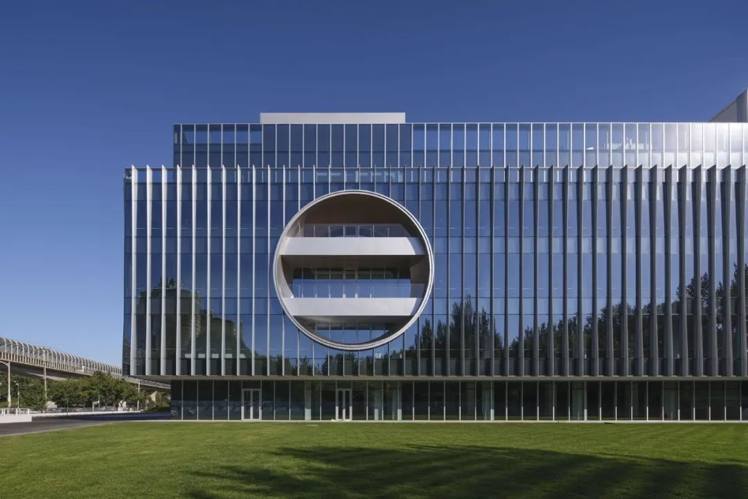 立面材质秉承着简洁的设计策略,以LOW-E玻璃与渐变造型的铝合金型材为主要材料,通过铝合金型材的渐变双曲造型,在室外不同角度可以感受到不同视觉效果,同时可以保障室内采光及私密性。