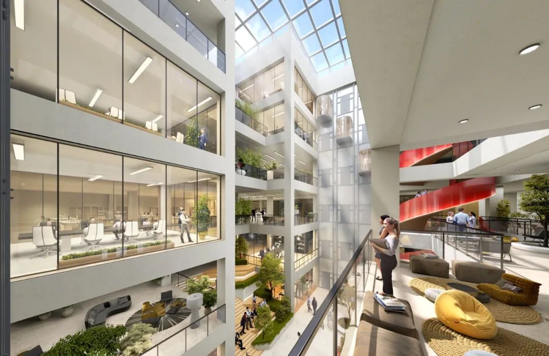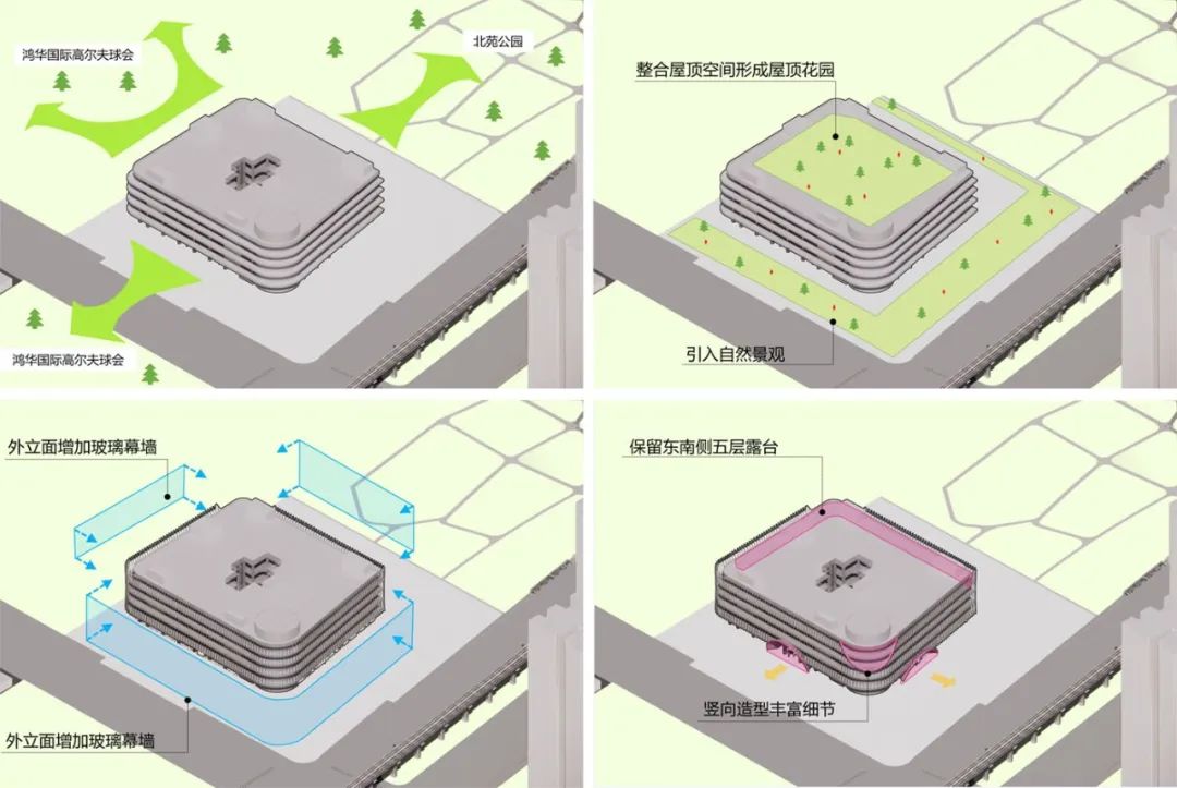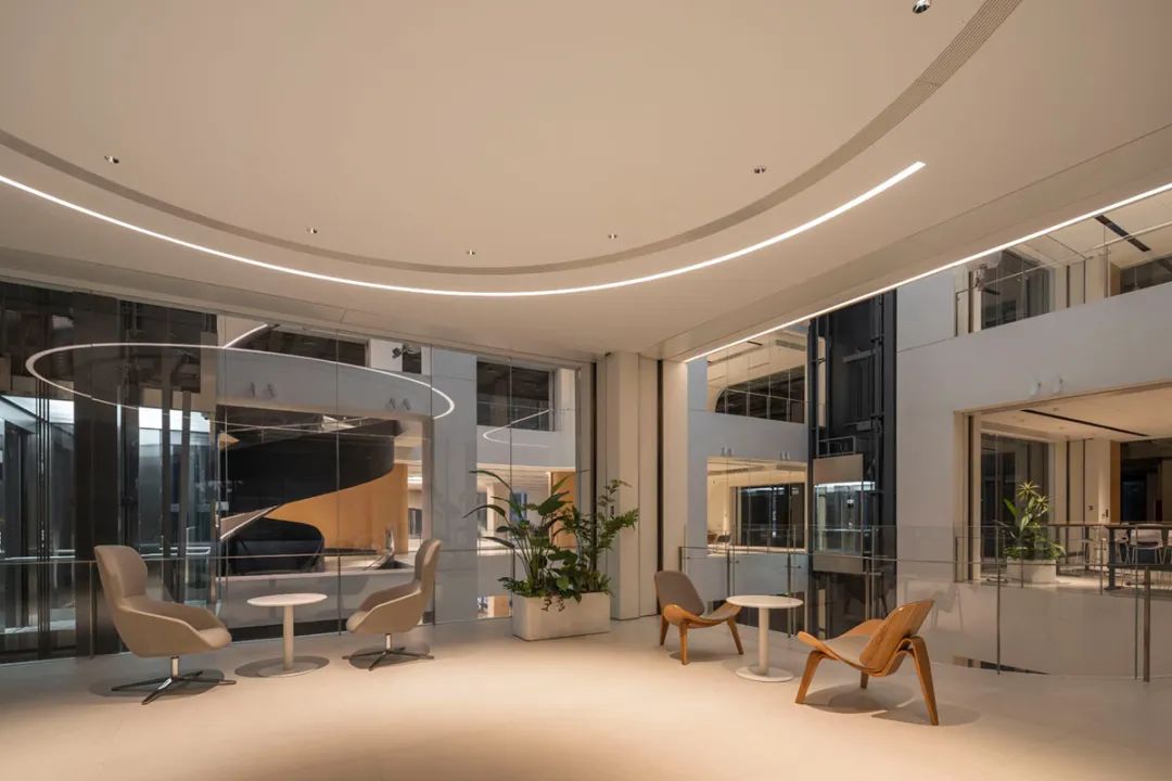 同时由于既有建筑缺少大堂、休闲空间等办公建筑必备的核心区域,故在主要展示面(北侧)及车站临近面(西侧)设置主次入口大堂,兼顾企业形象展示及员工流线的便利性。而特色十字中庭的景观电梯和旋转楼梯构成了建筑的中央枢纽。同时可以围绕艺术楼梯周边举办各种讲演,展览,休闲等日常活动,打造共享交流空间,为舒适的办公环境打下基础。