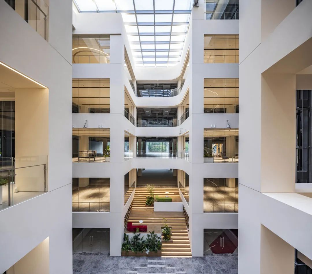 面对严重的采光问题,如何解决近60m的大进深成为了平面改造中最急切的难题。打开中庭,引入自然光成为了当下的最优解,为在此工作的每一位员工设计一处可供小憩的“绿谷”,给予建筑内部各个办公组团的每个角落沐浴阳光的机会,赋予原本幽深的内部空间生机与活力。而作为改造项目,应最大程度保留原有建筑可利用的基础,在踏勘整合了现状情况后,我们提出了以“50%利旧+30%提升+20%亮点”为核心的设计策略。