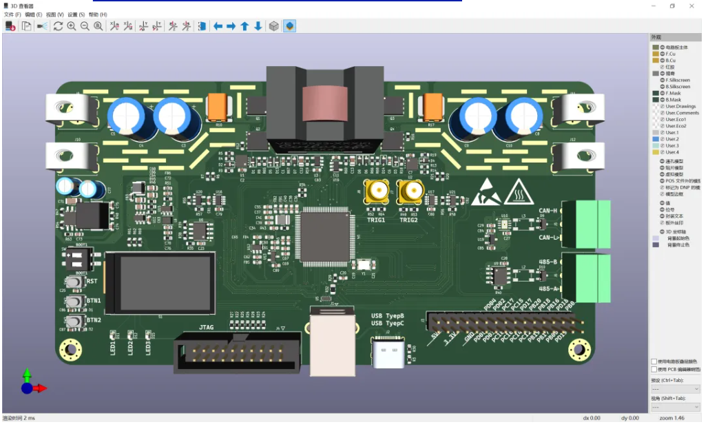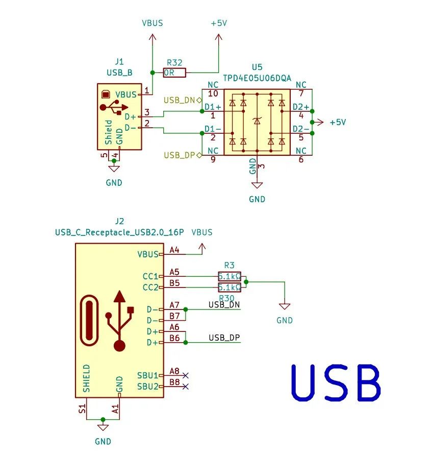 写配套的上位机共同调试运行,在本项目中提供了USB Type-B和Type-C接口,主要看重了B口的坚固耐用和C口的便利性,不过在作者实际调试中已经考虑将B口换为A口。VBUS被连接到MCU的对应管脚,供USB外设使用。