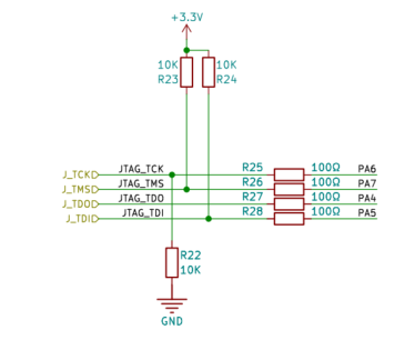 JTAG引脚为PA4~PA7,连接了适当的终端电阻与上下拉电阻,通过20p简易牛角座连接到外部调试器。