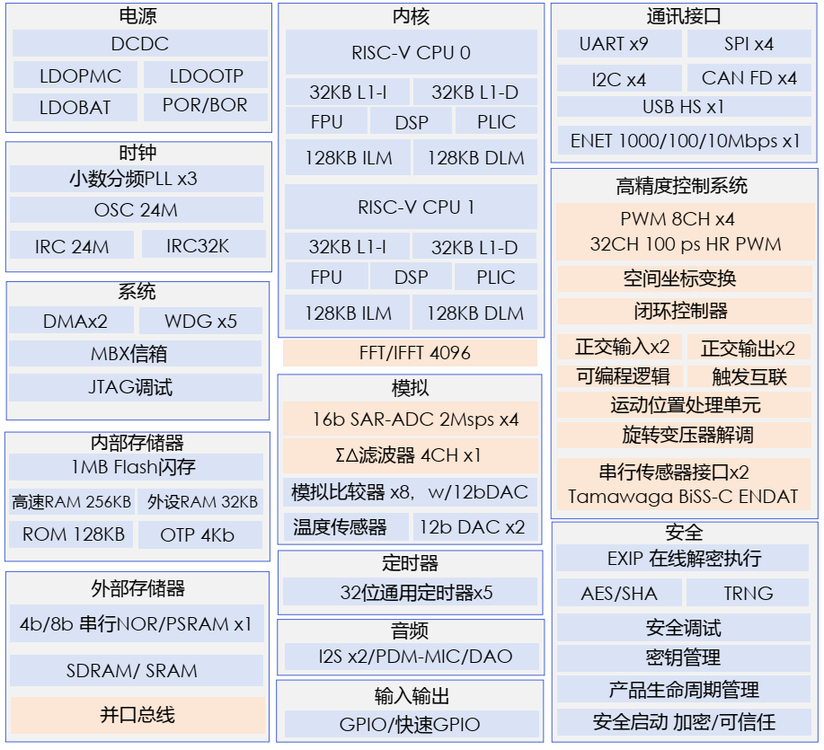 HPM6P00系列保持了HPM系列MCU一贯的高性能设计,最高可支持双核600MHz,对于主打的运动控制也是下足本事,配备的100ps分辨率的PWM与2Msps 16bit的ADC是实现精确控制的基础,还有硬件闭环、硬件逻辑、各种