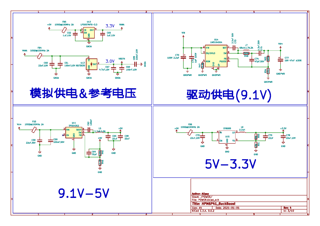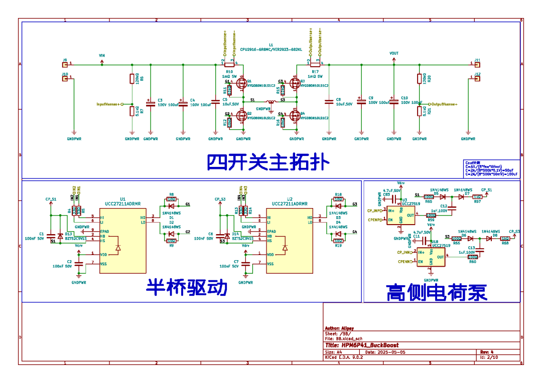 在国产MCU日益发展的当下,作者通过视频宣传,群友推荐等渠道了解到了先楫半导体(HPMicro),也通过HPM出售的各种EVK(6750EVKMini、5300EVK、6E00EVK等)体验过HPM带来的高性能体验;不过,限于EVK的设计目的,部分引脚被板上的外设占用,所以作者决定以HPM最近发布的HPM6P00系列为基础,设计一款电力电子方向的开发板 尽管6P00的运动控制系统精心设计,性能优异,但是我仍然选择了四开关BuckBoost(也称同相BuckBoost)作为开发板的主体功能,这是因为作者曾以此作为毕业设计题目,进行过一定研究,预计可以减少设计过程中的谬误,且硬件闭环等功能经过恰当配置也许可以应用于本项目。