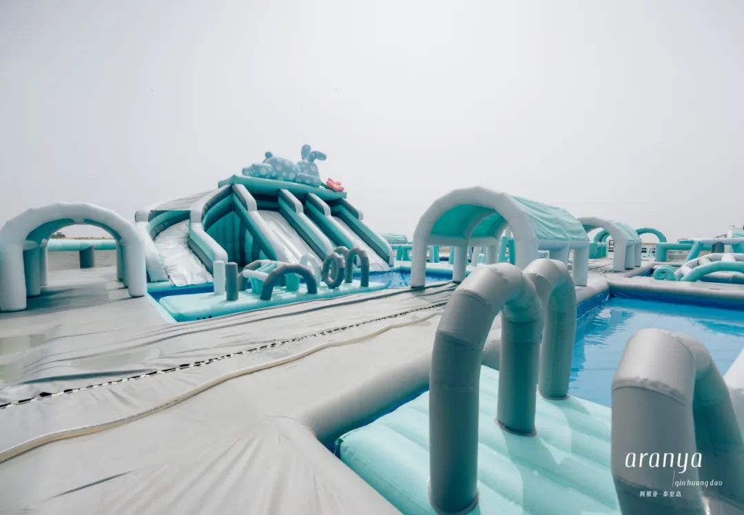北岸水上充气乐园内部配备了滑梯和卡通造型,因其多样的娱乐功能和吸引人的城堡设计,成为度假休闲场所的热门选择,为儿童和成人提供有趣的水上娱乐体验。