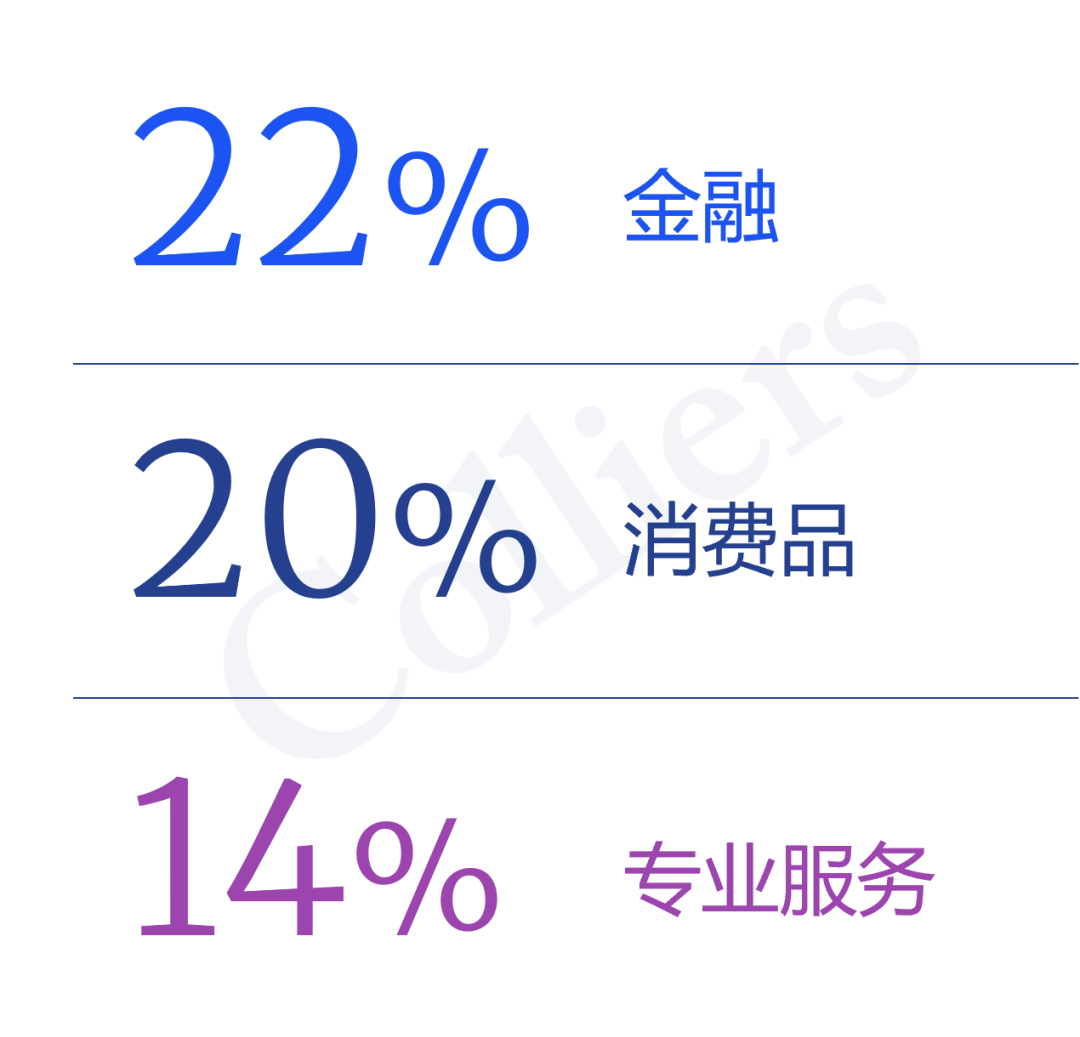 行业需求结构方面,2025年上半年金融、消费品及专业服务成为前三大租赁需求来源。值得注意的是,消费品行业首次跃居第二位,主要受益于消费刺激政策落地及新消费趋势的渗透;从细分领域看,零售快消与宠物经济表现尤为活跃。