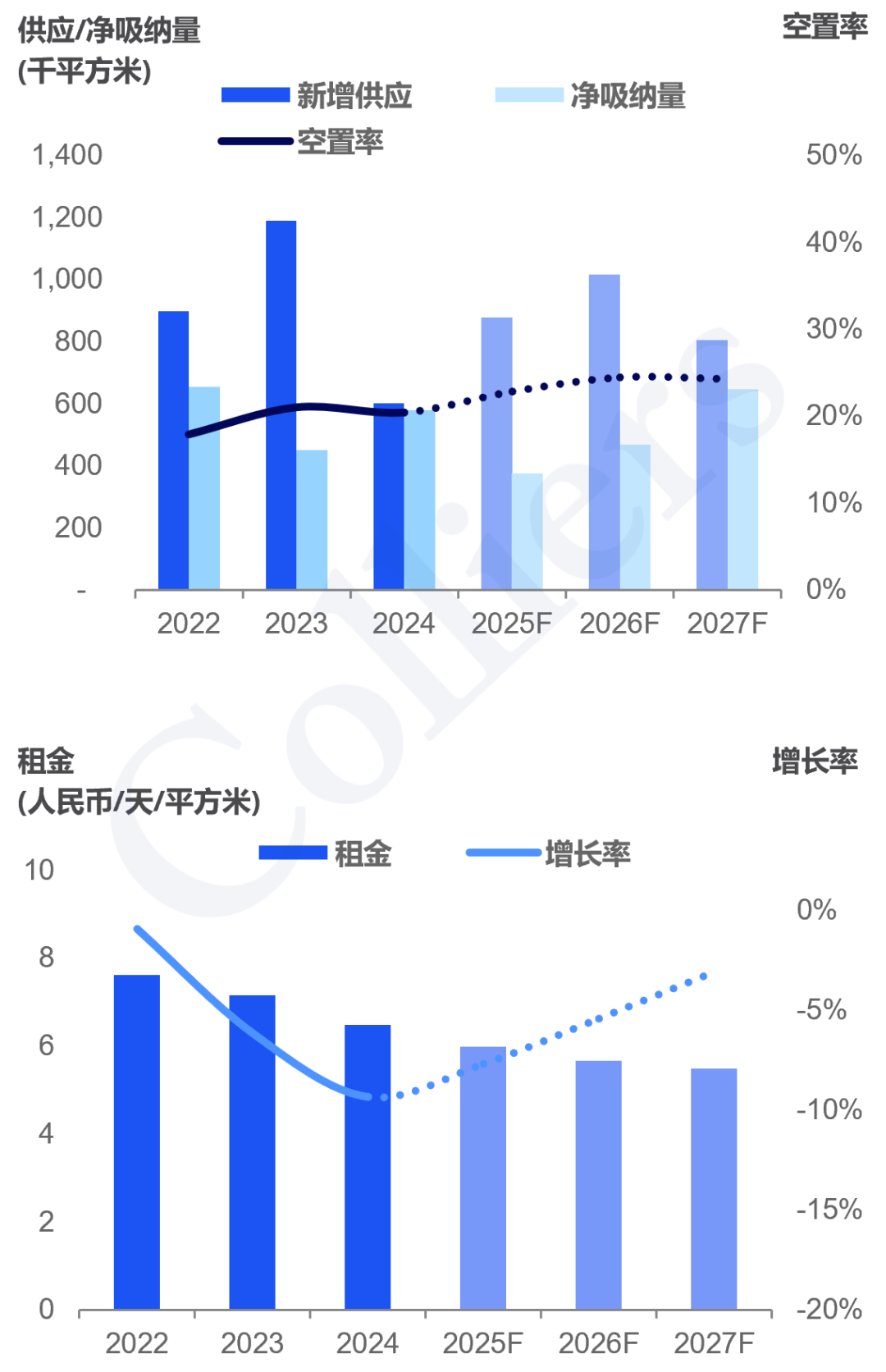 预计2025年,约73%的新增供应量将集中在DBD次核心板块。预计2025-2027年上海写字楼市场预计将迎来270万平方米的新增供应,市场供过于求的局面短期内难以缓解,空置率将进一步攀升。