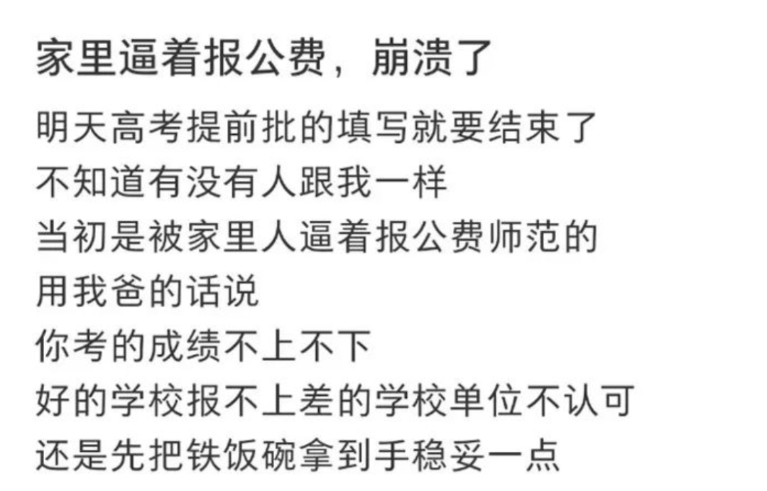 很多网友分享,自己当初报志愿根本没想清楚公费师范生意味着什么,大多数是被父母推着作出了这个选择:
