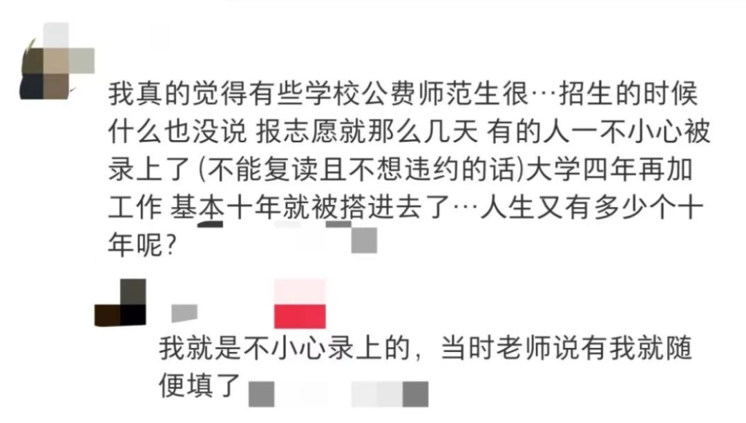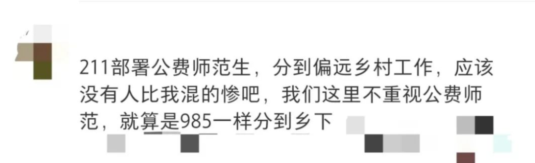 毕竟他们出于个体选择,也不想本可以填个985/211院校毕业后到大城市发展,现在填了公费师范生后,却彻底无望回到城市。