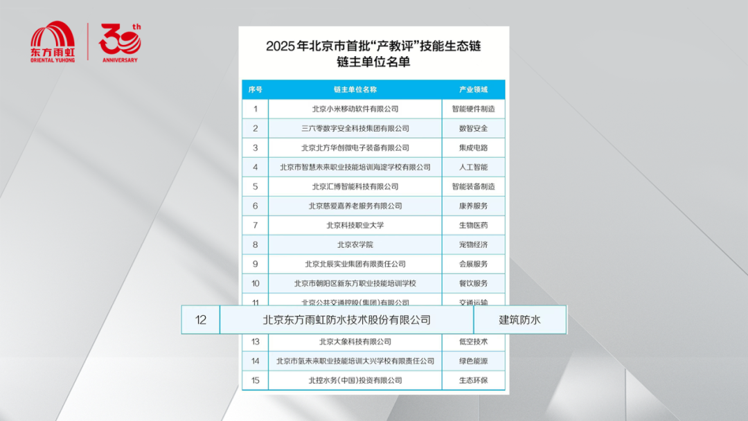 东方雨虹入选2025年北京市首批“产教评”技能生态链链主单位名单