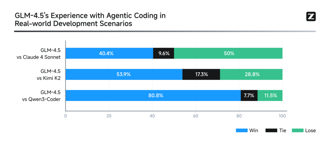 真实场景表现比榜单更重要。为了评测GLM-4.5在真实场景Agentic Coding中的效果,我们接入Claude Code与Claude-4-Sonnet、Kimi-K2、Qwen3-Coder进行对比测试。测试采用52个编程开发任务,涵盖六大开发领域,在独立容器环境中进行多轮交互测试。实测结果显示(如下图),GLM-4.5相对其他开源模型展现出竞争优势,特别在工具调用可靠性和任务完成度方面表现突出。尽管GLM-4.5相比Claude-4-Sonnet仍有提升空间,在大部分场景中可以实现平替的效果。