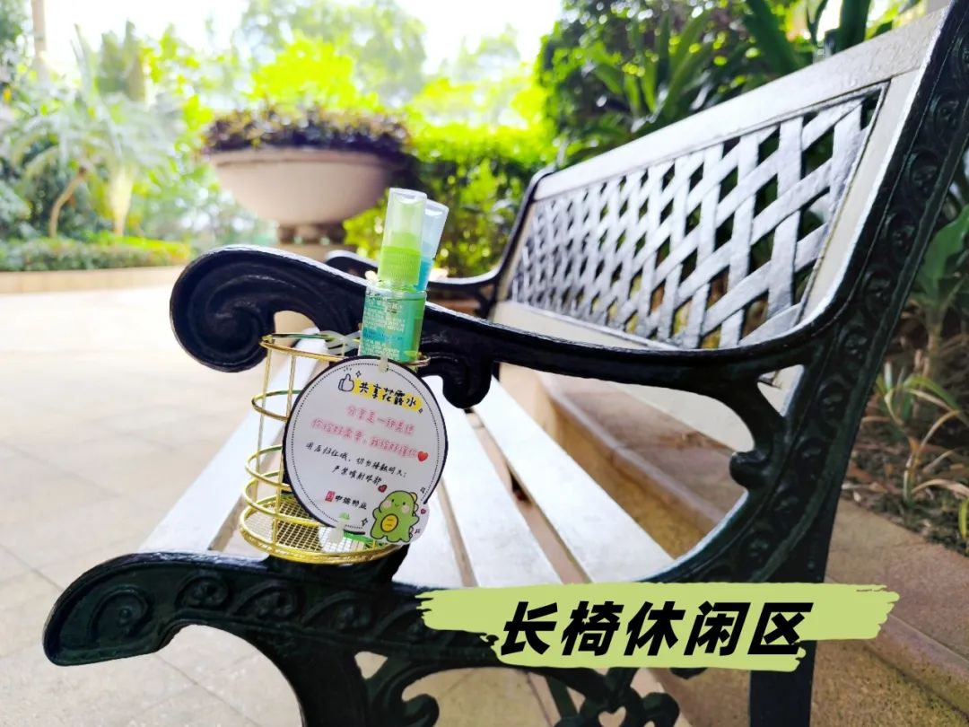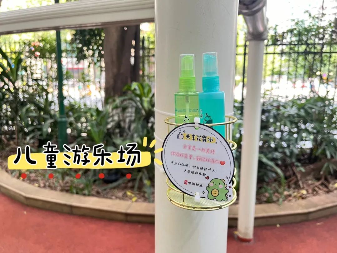 在社区公共休闲区、儿童游乐场等高频活动区域,专门设置驱蚊花露水便民取用点,为玩耍、休憩的业主提供即时防蚊保障,用细节服务筑牢户外防护屏障。
