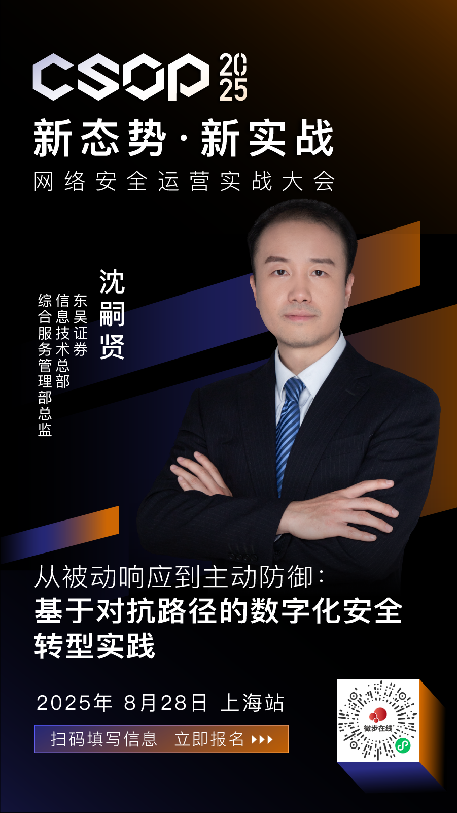 东吴证券沈嗣贤将在CSOP大会上海站带来主题分享《从被动响应到主动防御:基于对抗路径的数字化安全转型实践》,在分享中,沈嗣贤将基于上述三个问题深入剖析,以对抗路径为切入点聚焦核心技术方向,提出技术工具实现联合防控新方法。
