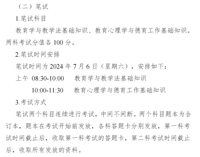 笔试科目:教育学与教学法基础知识及教育心理学与德育工作基础知识。