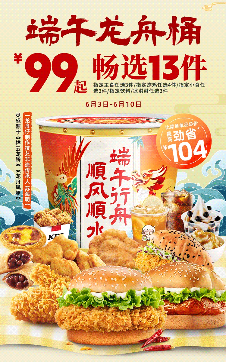 端午龙舟桶自2024年6月3日起至6月10日上市。活动期间,可以指定金额在指定品类中任选指定数量的指定产品,详情以菜单显示为准。端午龙舟桶定制桶包装共计限量100万个,随餐发完即止。海南地区不供应端午龙舟桶定制桶包装,具体包装以实物为准。活动渠道:堂食-柜台点餐/堂食-自助点餐机/堂食-自助点餐到店自取。活动时间:9:30-23:00。活动地区:全国。堂食具体供应时间以餐厅实际营业时间为准,仅限有此产品供应的部分肯德基餐厅,交通枢纽、旅游景区、西藏自治区的餐厅及精选餐厅等部分餐厅除外,具体情况以餐厅餐牌公示为准。除推广产品外,其他物品仅做装饰目的,图示内容仅供参考。产品、周边、玩具及包装以实物为准。不与其他优惠共享。堂食、肯德基宅急送自有渠道、第三方外卖平台外送渠道、甜品站、团购渠道、企业送渠道及其他渠道的产品组合、价格及优惠活动,以各渠道页面展示为准。