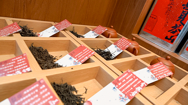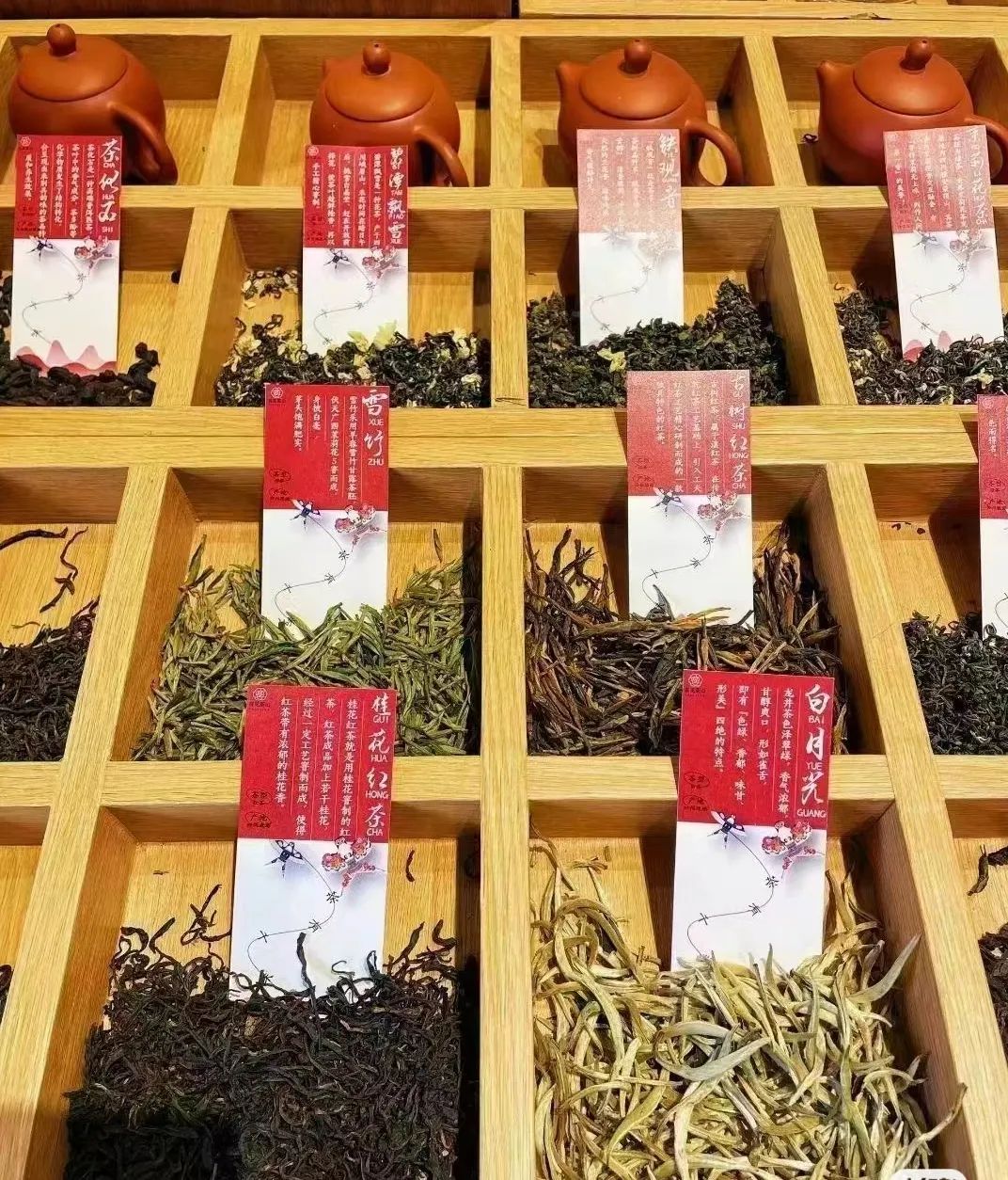 「喜见茶山」聚焦东方原叶,精选十余种茶叶,包含琥珀红茶、绿茶、观音、茉莉、乌龙、月桂等品类,店内还将所用茶叶进行了专柜展示,足见其品质的用心。