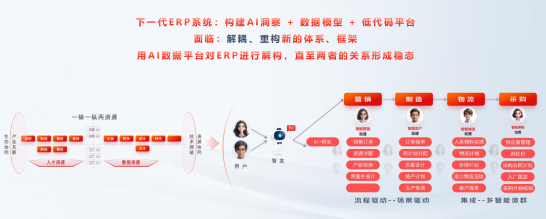 智能体层:通过低代码平台和智能体构建工具,开发具备业务流程能力的“数字员工”和“数字秘书”,实现人机同作业。