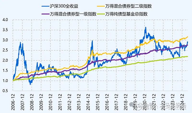 图中列出了2007年至今沪深300、纯债基金指数、一级债基金指数和二级债基金指数的收益曲线图。不难发现从长期来看这些平均权益仓位在30%及以下甚至无任何权益仓位的纯债基金的投资回报跟沪深300差不多,与此同时投资体验还要高出不少。