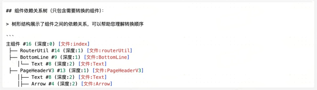 结合人工转译的操作经验,一般先按页面一个个进行转换,当转换某个页面时,需要把这个页面及其依赖组件都进行转译。所以我们需要进行代码依赖分析,圈定转译范围。依赖往往是多层嵌套的,我们需要按顺序进行转译,不仅需要找到依赖的全部组件,还需要知道依赖层级深度。下面是依赖分析结果示例: