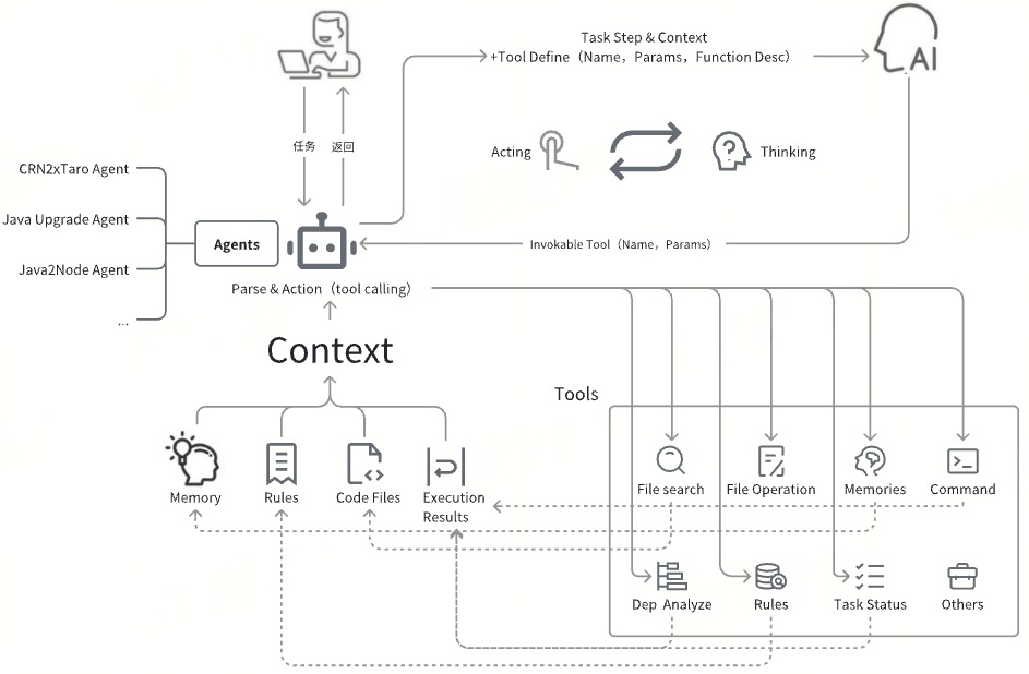 基于丰富的工具集合提供上下文信息,包括代码依赖分析、文件检索和操作、Memory(历史对话记录),规则知识库(具体转译/迁移场景的规则),代码以及仓库信息,Bash命令执行的结果、任务状态管理信息等。