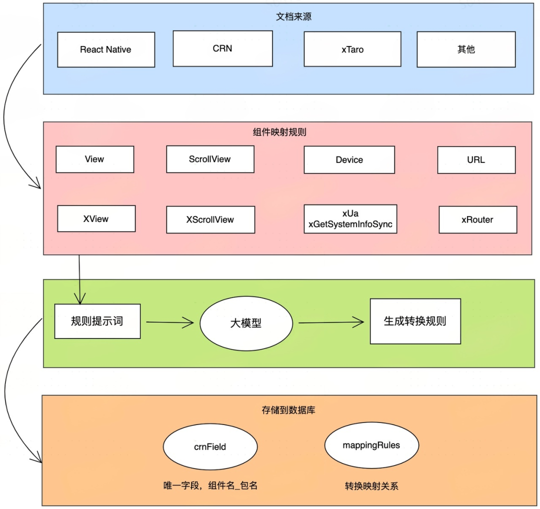 我们使用爬虫手段把内外部的文档内容都获取到,根据整理的组件映射表。在做CRN转xTaro的时候,需要让大模型知道之前CRN上使用的组件,在xTaro上的平替是什么,比如在CRN工程使用View这个组件,在xTaro工程下使用的是XView,以及两个组件属性字段和API对应关系。
