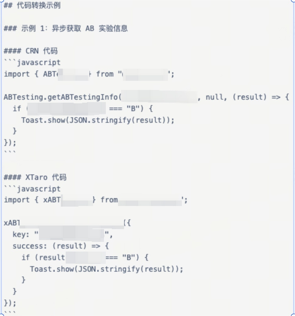 我们基于这份数据做了可视化,方便我们检查生成质量以及后续维护,以ABTest组件为例,内容包括了组件转换概述,导入组件方式,API映射规则,相关代码样例few-shots,最后还有注意事项,是一些开发经验内容沉淀。下面是示例: