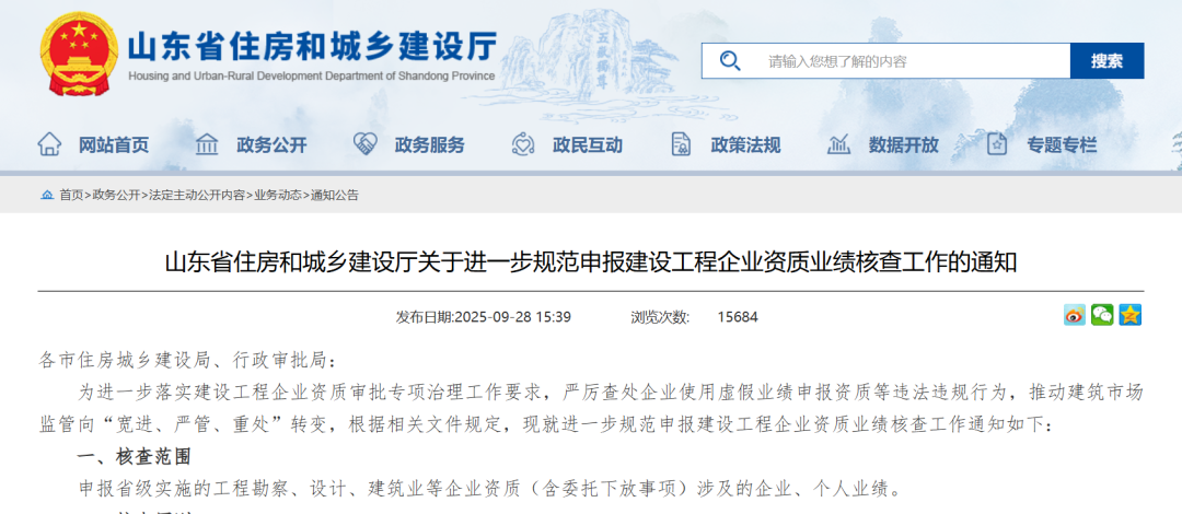 山东省住房和城乡建设厅《关于进一步规范申报建设工程企业资质业绩核查工作的通知》