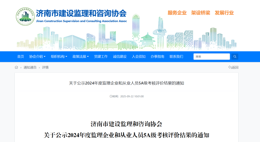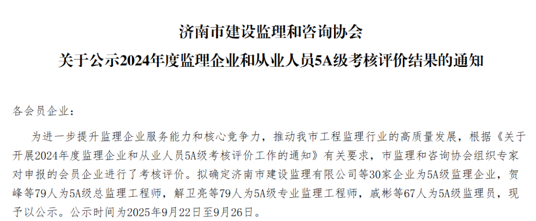 济南市建设监理和咨询协会《关于公示2024年度监理企业和从业人员5A级考核评价结果的通知》