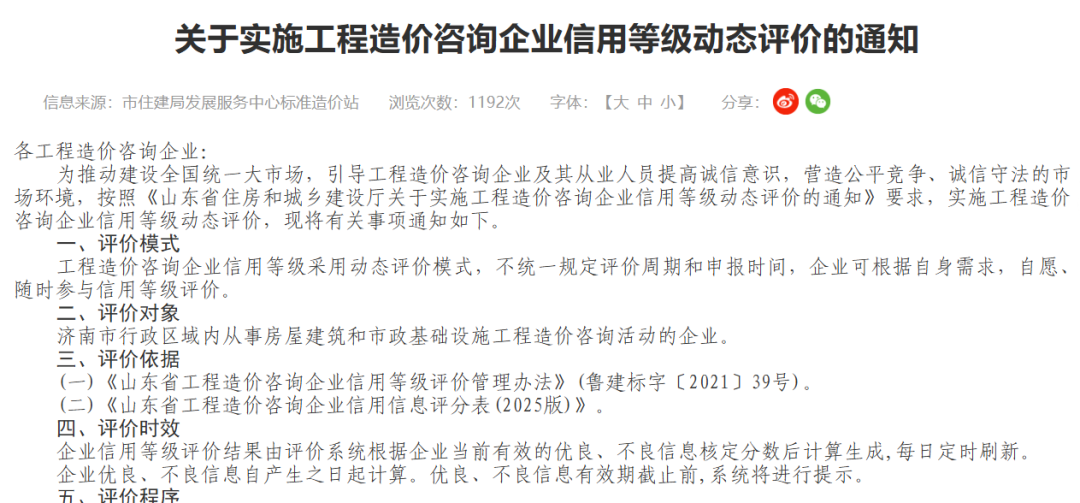 济南市住房和城乡建设局《关于实施工程造价咨询企业信用等级动态评价的通知》
