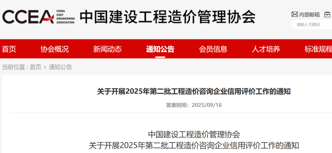 中国建设工程造价管理协会《关于开展2025年第二批工程造价咨询企业信用评价工作的通知》