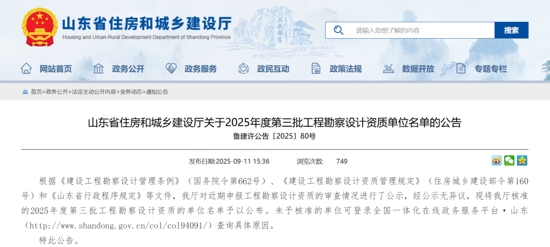 山东省住房和城乡建设厅《关于2025年度第三批工程勘察设计资质单位名单的公告》
