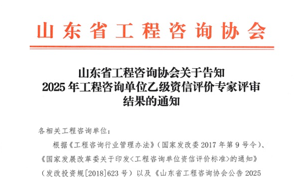 山东省工程咨询协会《关于告知2025年工程咨询单位乙级资信评价专家评审结果的通知》