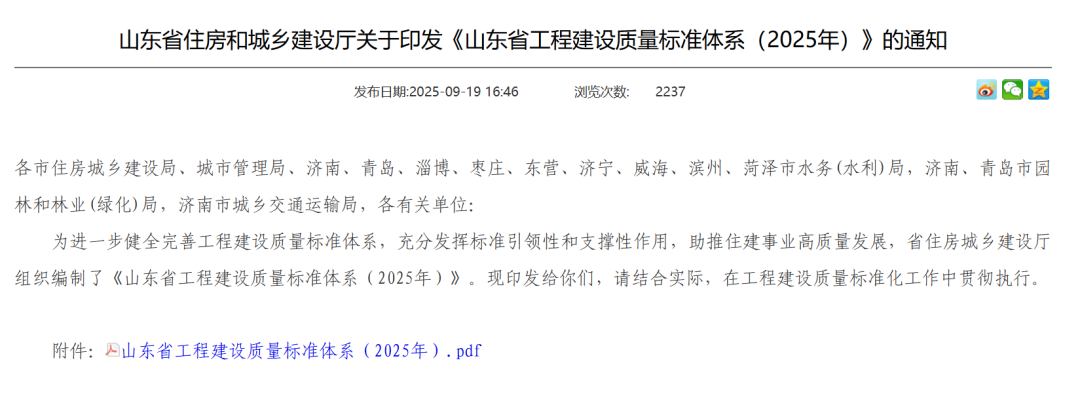 山东省住房和城乡建设厅关于印发《山东省工程建设质量标准体系(2025年)》的通知