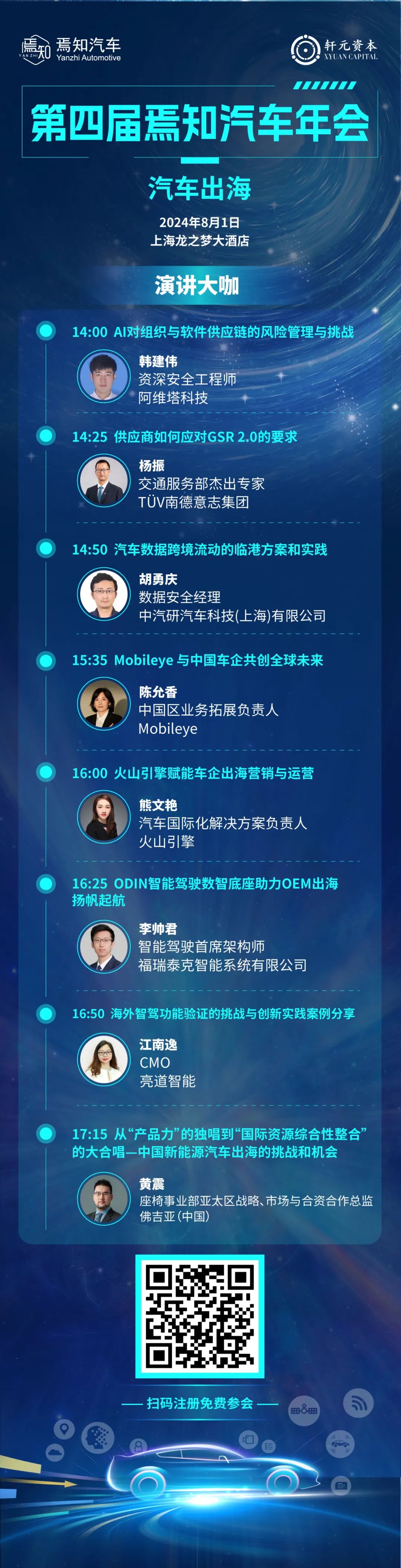 由焉知汽车科技主办的第四届焉知汽车年会,即将于8月1日-2日在上海举办。亮道智能受邀参加,CMO江南逸女士8月1日在汽车出海论坛发表主题演讲。