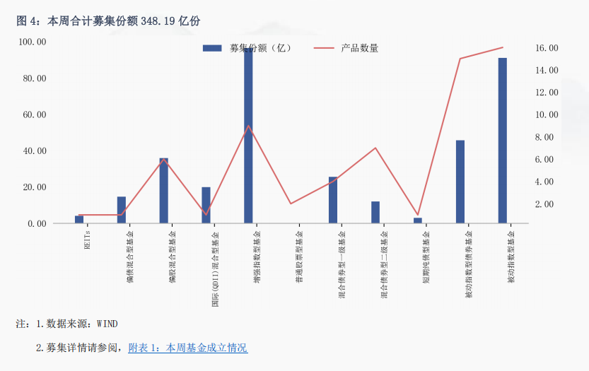 本周共有63只基金成立,合计募集份额348.19份。其中,REITs1只,募集规模4.00亿份;债券型基金27只,募集规模86.12亿份;国际(QDII)基金1只,募集规模19.81亿份;混合型基金7只,募集规模50.56亿份;股票型基金27只,募集规模187.70亿份。
