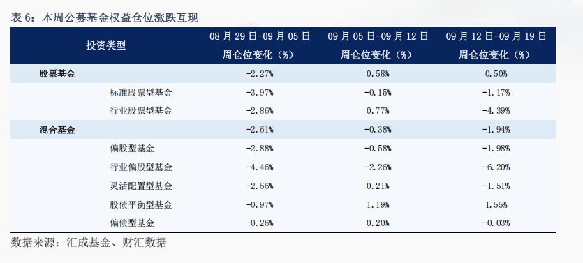 本周公募基金权益仓位涨跌互现。截至09月19日,采用主成分分析法测算的基金仓位中,公募基金权益仓位涨跌互现;股票型基金权益仓位测算结果较09月12日上涨0.50个百分点;混合型基金权益仓位测算结果较09月12日下跌1.94个百分点;子类别中,股债平衡型基金基金仓位上涨最高,测算结果较09月12日上涨1.55个百分点。