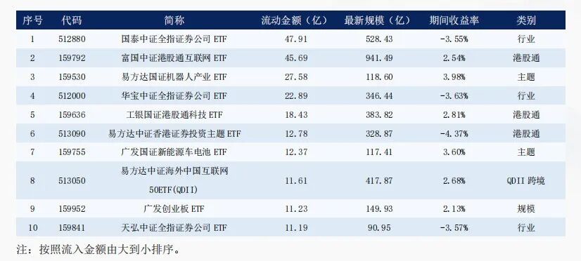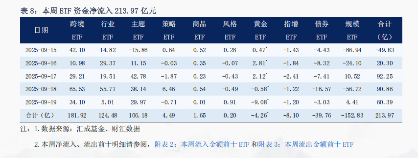 本周ETF资金净流入213.97亿元。其中,跨境ETF流入最多,净流入181.92亿元;规模ETF流出最多,净流出-152.83亿元。