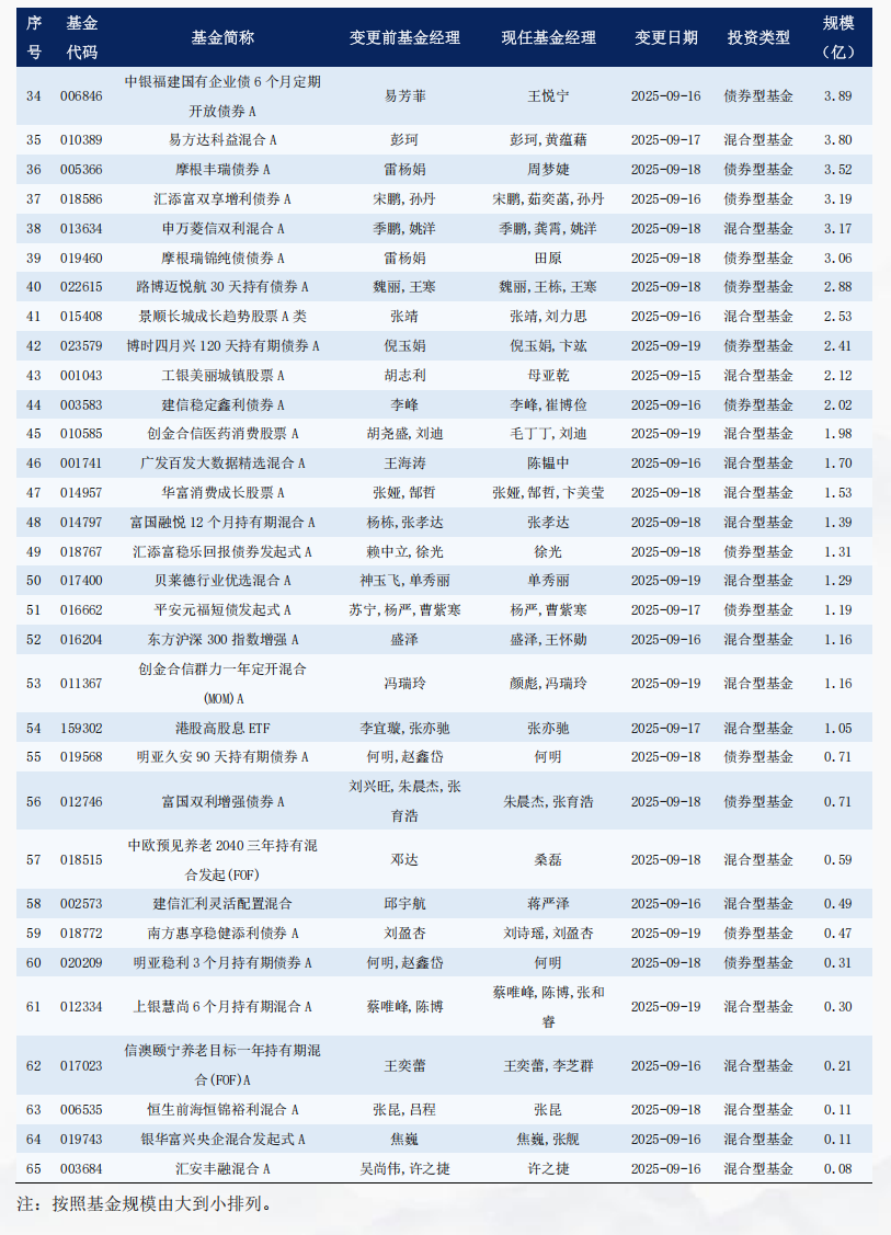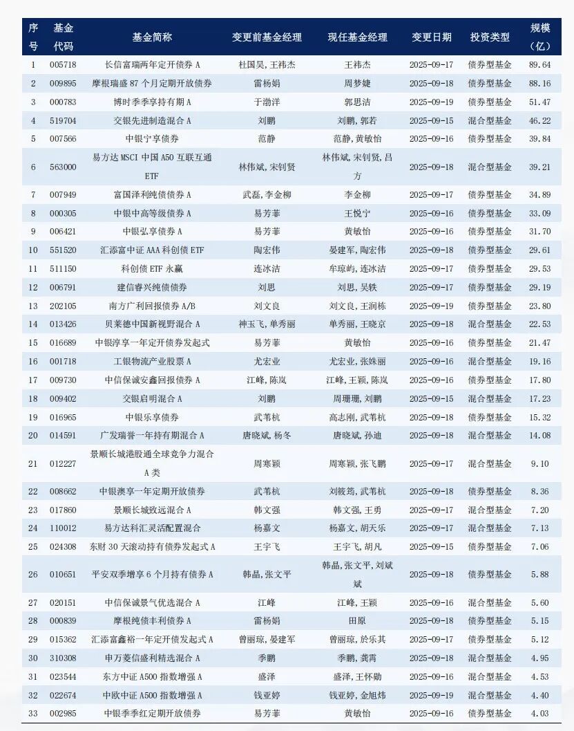 本周有65只公募基金产品公告基金经理变更,累计涉及基金规模为822.89亿元。其中,债券型基金33只,规模合计596.78亿元;混合型基金32只,规模合计226.11亿元。