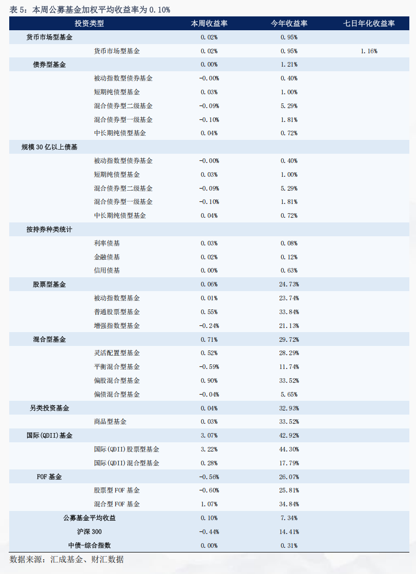 1.3 基金表现:本周公募基金加权平均收益率为0.10%