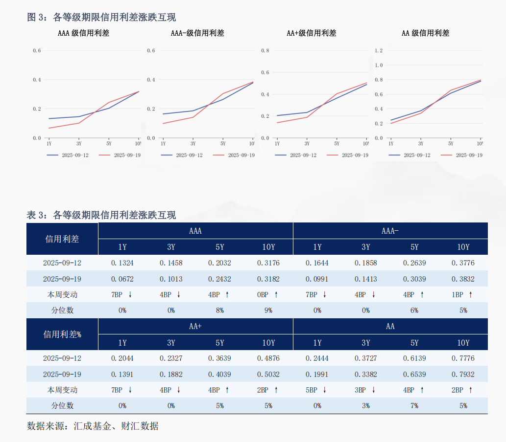 本周各等级期限信用利差涨跌互现。其中5YAAA、5YAAA-、5YAA+、5YAA等级收益率上行幅度最大,为4BP;1YAAA、1YAAA-、1YAA+等级收益率下行幅度最大,为-7BP。