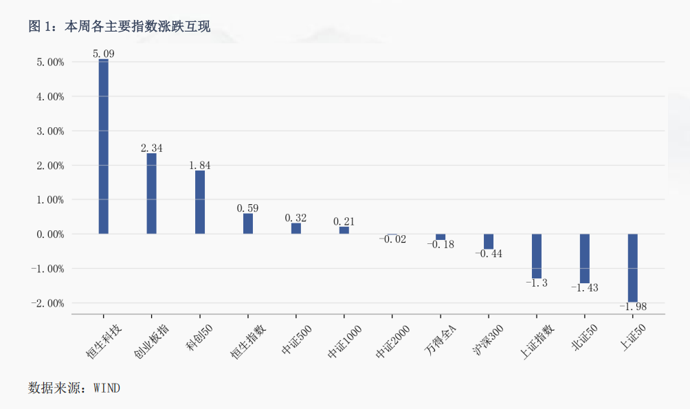 本周主要股指涨跌互现。上涨指数中,恒生科技涨幅最大,为5.09%,创业板指次之,为2.34%,科创50第三,为1.84%;下跌指数中,上证50跌幅最大,为-1.98%,北证50次之,为-1.43%,上证指数第三,为-1.30%。