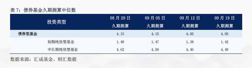 截至9月19日,债券型基金久期较上周持平,测算结果为4.05年。
