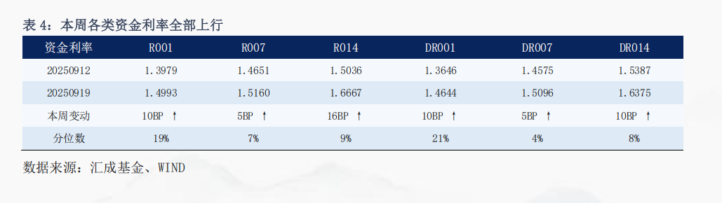 本周各类资金利率全部上行。其中R014上行幅度最大,为16BP。