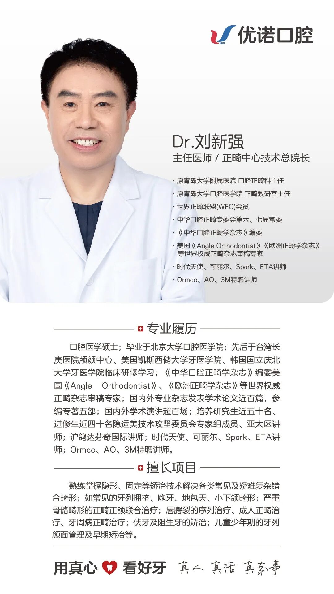 作为优诺口腔正畸中心技术总院长,刘新强教授将继续在正畸领域发光发热,凭借专业实力、丰富经验和无私奉献,为更多患者带来健康自信的笑容,为行业培养更多优秀人才,为全民口腔健康事业做出更大的贡献。