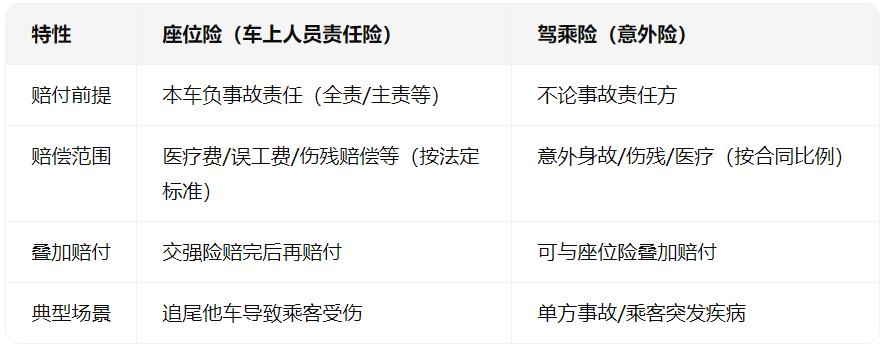 建议同时配置驾乘险+座位险,驾乘险覆盖意外风险,座位险兜底责任赔付,双重保障更安心!