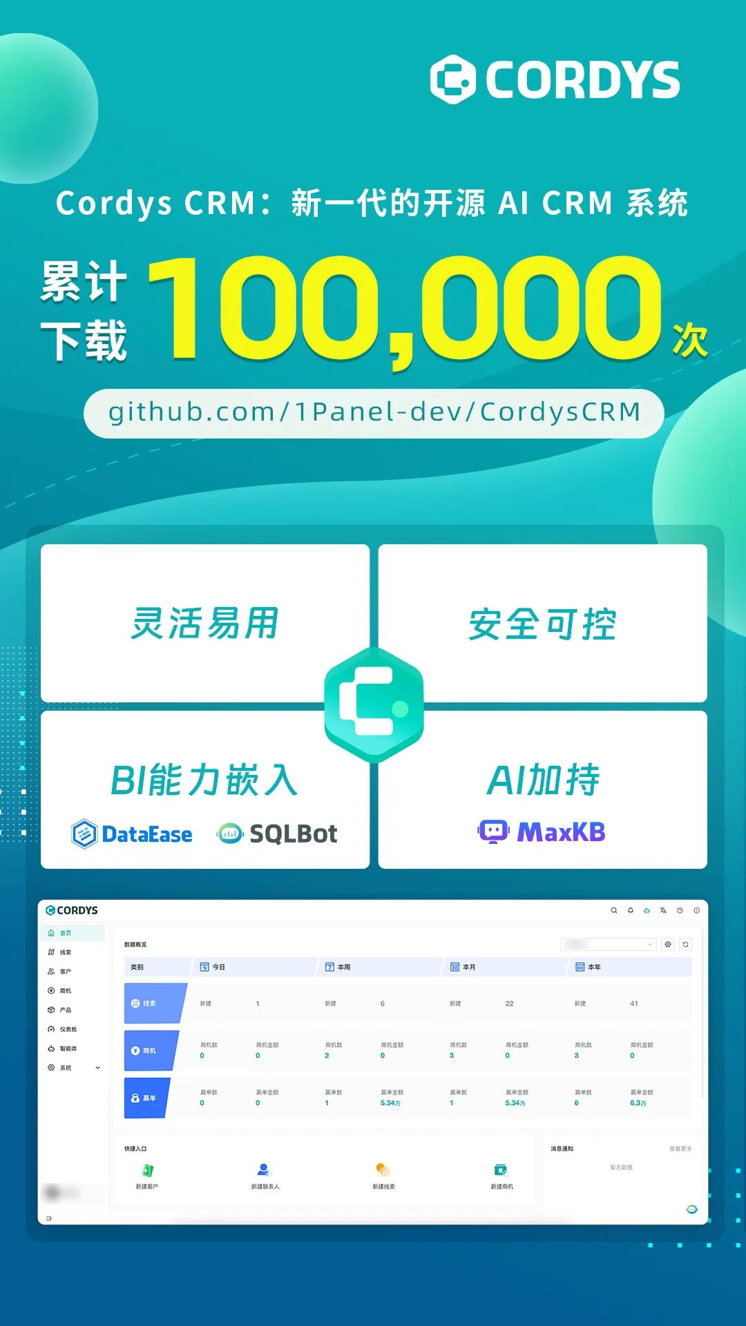 2025年9月20日,飞致云旗下开源项目Cordys CRM全网累计下载量突破100,000次。